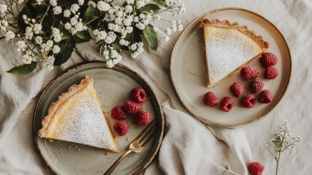 Enjoy a delightful lemon tart enriched with fresh raspberries, beautifully presented on rustic plates. Perfect for inviting gatherings or culinary photography.