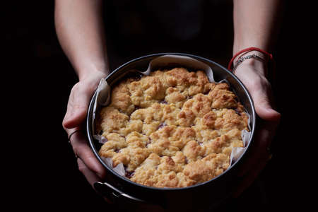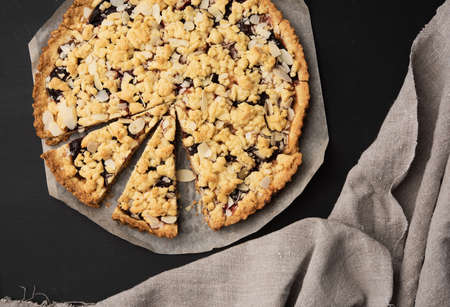 baked round crumble pie with plum cut into pieces on a black background, top view