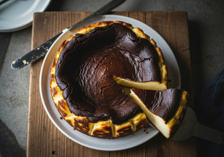 A delicious homemade Basque burnt cheesecake with a rich, caramelized top. A slice has been cut, served on a rustic board in a moody, dark setting.