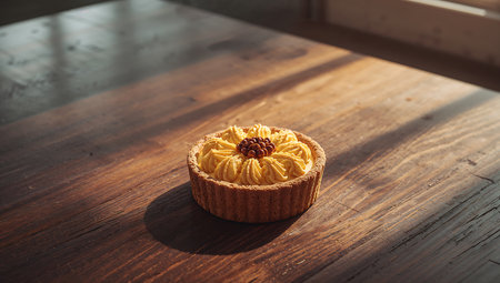 Egg tart on wooden table in cafe. Selective focus.