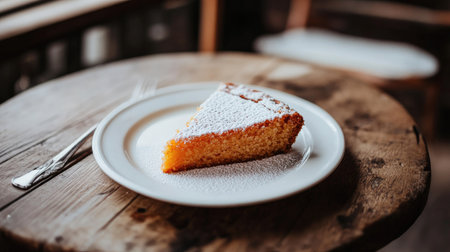 A freshly baked orange cake slice with a dusting of powdered sugar, elegantly presented on a white plate on a wooden table.