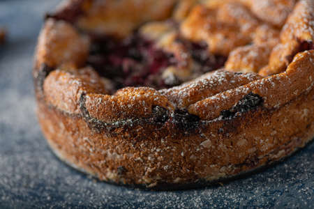 Delicious homemade baked fruit pie with powdered sugar.