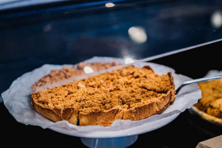 Close-up, pieces of grated pie on a shop window.
