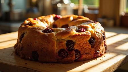 Golden-hour sunlight illuminates a rustic wooden board showcasing a delicious homemade blackberry bundt cake. Perfect for baking blogs, food magazines, or websites showcasing homemade desserts and summer treats. The image evokes feelings of warmth, comfort, and homemade goodness.