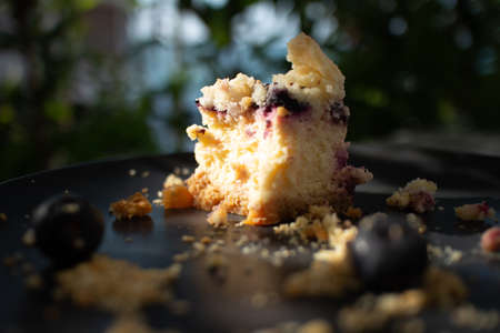 Blueberry cheese cake on black plate in the cafe.