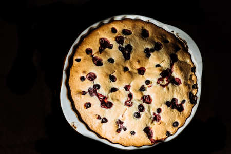 the process of making homemade pie with berries. The batter is poured into a baking dish. Homemade sweets, homemade pie