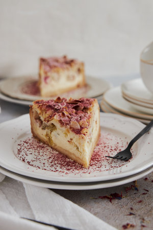 A closeup shot of delicious rhubarb cheese pie on a plate on a white table