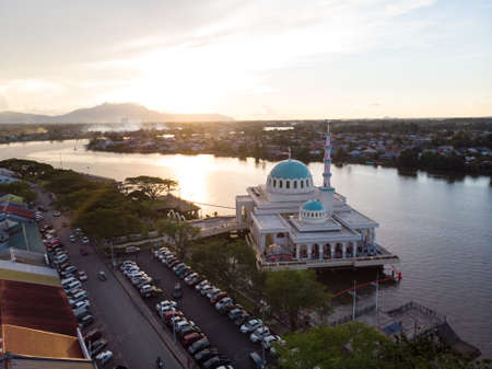 Aerial view of the beautiful floating mosque of Kuching or also known as masjid india during sunset
