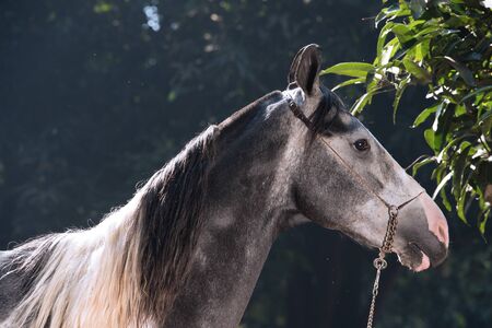 Portrait of piebald Marwari young stallion in garden at early morning. Gujarat, India