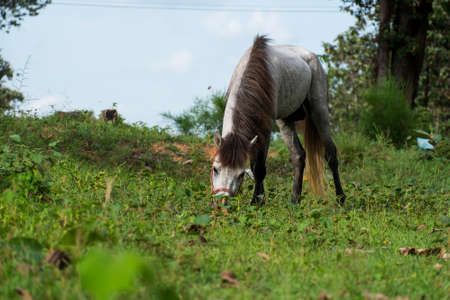 Portrait of a Beautiful Horse feeding in a grassy pasture