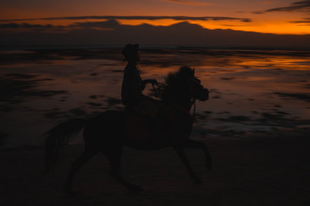 Horse unrecognized rider on the beach during sunset, captured in silhouette against a vibrant sky. The scene reflects on the wet sand, creating a picturesque, serene moment by the ocean.