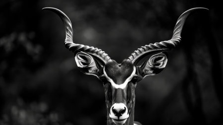 Witness the regal splendor of an antelope in this captivating headshot Its majestic horns, a testament to nature's artistry, frame a serene countenance with piercing eyes that reflect the vast savannah Against a minimalist backdrop, the antelope's exquisite features take center stage, inviting admiration for its extraordinary grace and beauty AI Generative