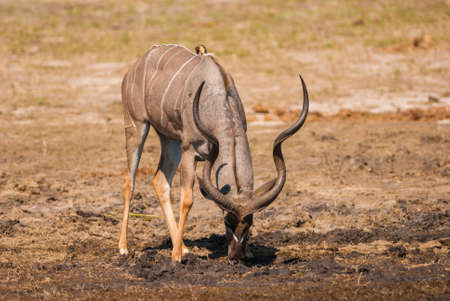Kudu bull grazing and drinking, Chobe National Park