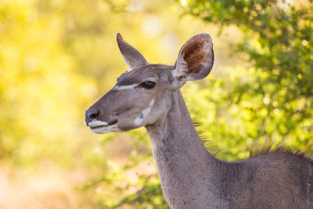 Cute elegant Kudu female head close up and portrait. Wildlife Safari in the Kruger National Park, the main travel destination in South Africa. Focused on eyes.
