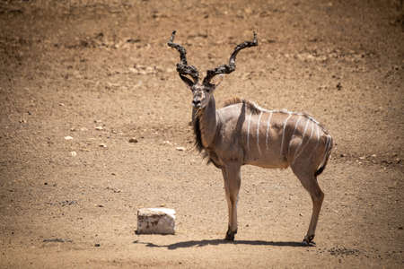 Male greater kudu stands beside salt block