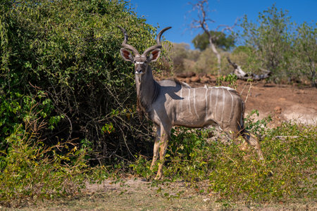 Male greater kudu standing staring by bushes