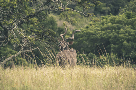 Kudu antelope with large horns in the thick African bush