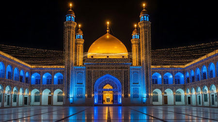 A stunning islamic mosque during ramadhan with bright lights and beautiful architecture.