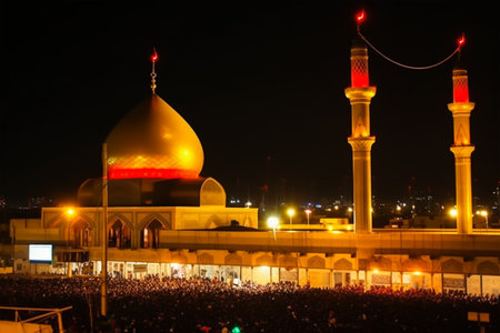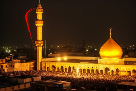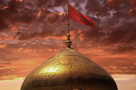 Generative AI Image of Golden Dome Mosque with Red Flag at Sunset in Month of Muharram Asyura
