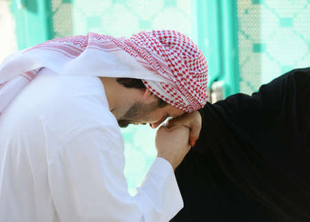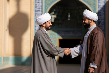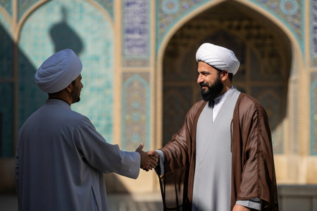 A photo featuring a gathering of men standing next to each other in a unified pose, Men greeting each other after prayer, AI Generated
