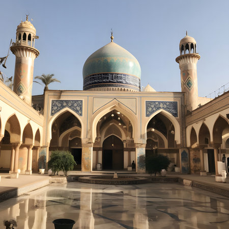 A serene courtyard inside a mosque in the Middle East, showing intricate architecture and traditional Islamic design.