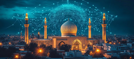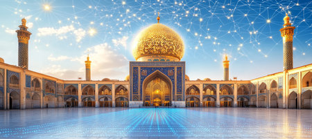 Imam Reza Shrine with Futuristic Digital Overlay, Blending Technology and Religion in Mashhad, Iran