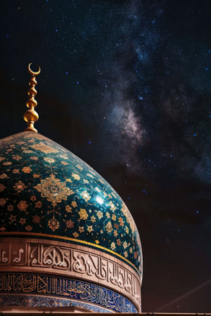 Golden mosque dome shining under the starry Milky Way, blending faith and celestial grandeur.