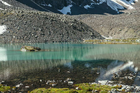Beautiful scenic landscape with turquoise mountain lake with transparent water and stony bottom. Azure glacial lake with clear water surface in sunlight. White snow and green grass near mountain lake.
