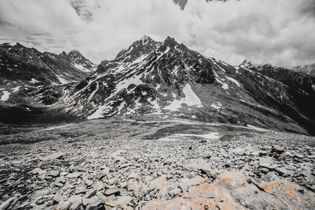 Alpine landscape with high snowy mountain with peaked top under cirrus clouds in sky. Atmospheric view to big snow covered mountains in sunshine. Black rocks and white-snow pointy peak in sunlight.