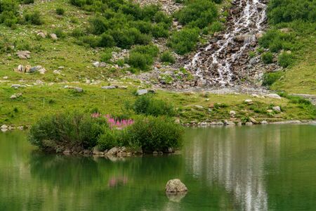 Picturesque lake with a flowering bush and stream on green hills, Austrien Alps