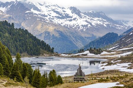 Morning winter Dolomiten mountain landscape. Ski resort Obergurgl - Hochgurgl, Tirol, Austria. All people are unrecognizable.