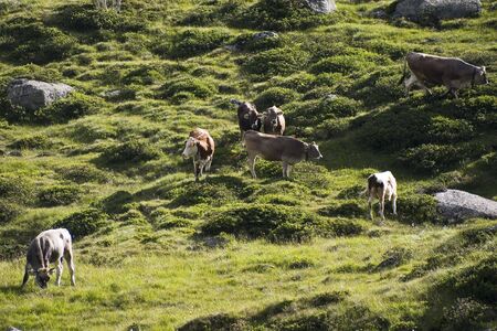 Cattle grazing near Zufallshuette in Martell valley (South Tyrol, Italy) on a sunny day in summer