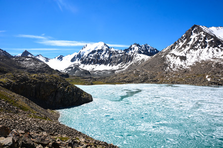 Beautiful landscape of snow-capped mountains and reflections in the lake. The concept of mountain climbing and extreme recreation