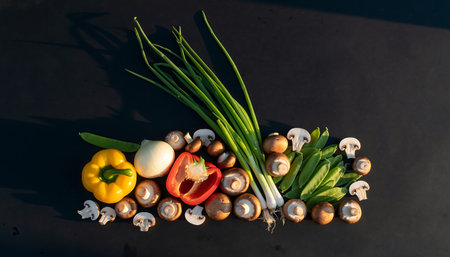 A colorful arrangement of fresh vegetables and mushrooms on a dark background.