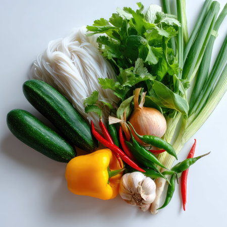 A vibrant arrangement of fresh ingredients for Asian dishes featuring rice noodles, assorted vegetables, and spices. Perfect for showcasing culinary diversity and healthy eating.