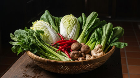 A cinematic wide shot (16:9) of a large woven basket filled with vibrant Asian vegetables, situated