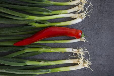 Green onion, red pepper and garlic on dark grey table. Top view photo.