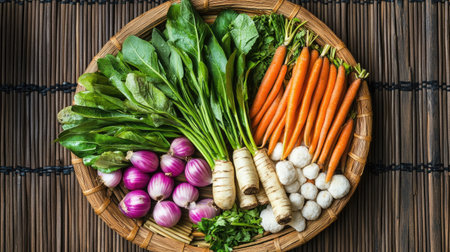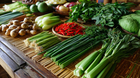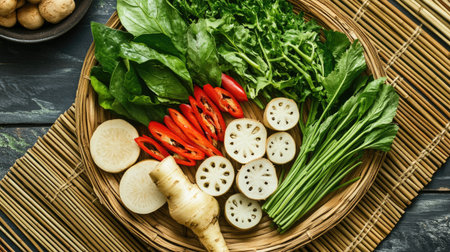 Top view of a vibrant mix of Thai vegetables, including lotus root, bamboo shoots, and water spinach, on a bamboo mat