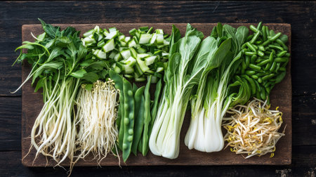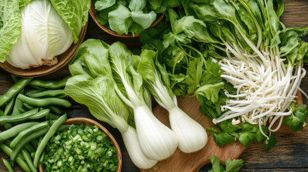 Top view of a variety of fresh Thai vegetables, including bok choy, green beans, and bean sprouts, on a wooden board