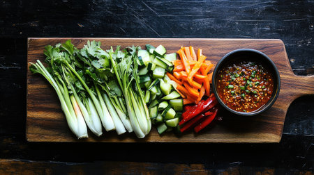 An overhead shot of an elegant wooden board displaying various blanched vegetables next to a small bowl of homemade chili dip, highlighting the dish's freshness.