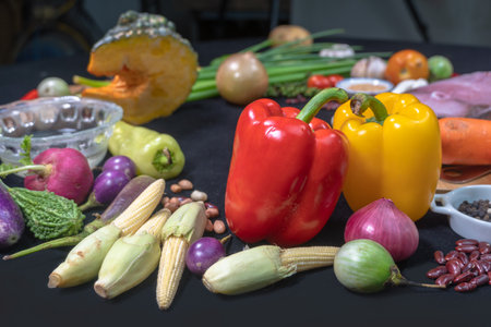 Top view of vegetables arranged on black table with center copy space. High angle view of lettuce on black surface with mushrooms, tomatoes, cut onion, corn and pepper on black surface with empty space in center.