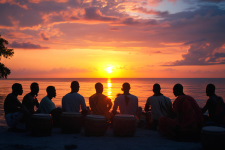 Garifuna musicians playing vibrant drums while sitting on the beach, surrounded by the stunning colors of a sunset over the Caribbean sea