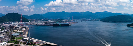 Aerial panorama of Hiroshima Bay with bridges and boats