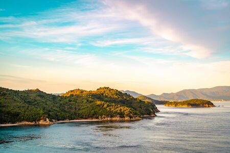 Scenic view from Hiroshima port at sunset with Togeshima and Etajima islands in the background