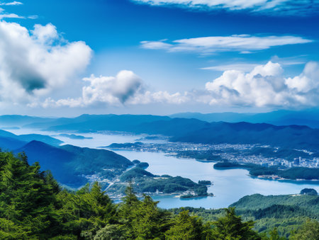 Generative AI : Aerial view of Lake Motosu during koyo season Yamanashi Japan