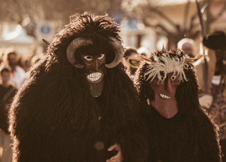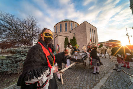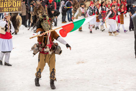 Pernik, Bulgaria - 28 January 2018: Participants take part in the International Festival of Masquerade Games Surva. The festival promotes variations of ancient Bulgarian and foreign customs and masks.