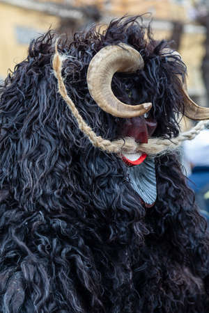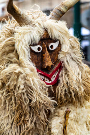 Portrait of a participant in woolly outfit and handmade, carved mask at the traditional Buso-walking Busójárás festival at Mohacs, Hungary