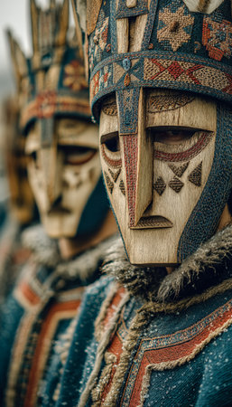 Intricate carved wooden masks adorned with vibrant textiles evoke cultural artistry, highlighting craftsmanship and ceremonial elegance.