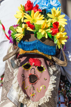 MOHACS, HUNGARY - FEBRUARY 14: Unidentified person wearing mask for spring greetings. In this year during the COVID pandemic the public Busojaras event was canceled. February 14, 2021 in Mohacs, Hungary.