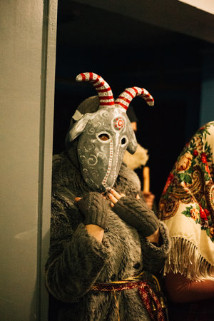 MOHACS, HUNGARY - FEBRUARY 16: Unidentified person wearing mask in Busojaras. In this year during the COVID pandemic the public Busojaras event was canceled. February 16, 2021 in Mohacs, Hungary.